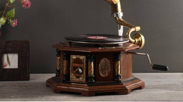 All gramophones are crafted with a premium teak wood base, outfitted with an either brass or steel horn, and include a winding handle. Available as modern replicas or original antiques. Portable gramophones available. Select gramophones include a sound box, special vinyl record, extra needles, and/or a wooden case. Replacement parts can be purchased separately.
