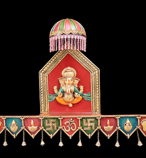 Wall Hanging Hand Crafted Ganesh Chatri Toran With Bell in Ceramic Crush Material With Wooden Base, Fine Hand Crafted Art Work, Washable Material, Pure Brass Bells With Natural Deco Paint finish.