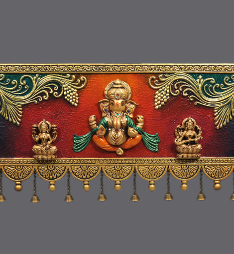 Ganesh/Laxmi/Saraswati Toran Wall Mural With Bell,Duco Paint Wooden GLS Bell Toran, For Decoration