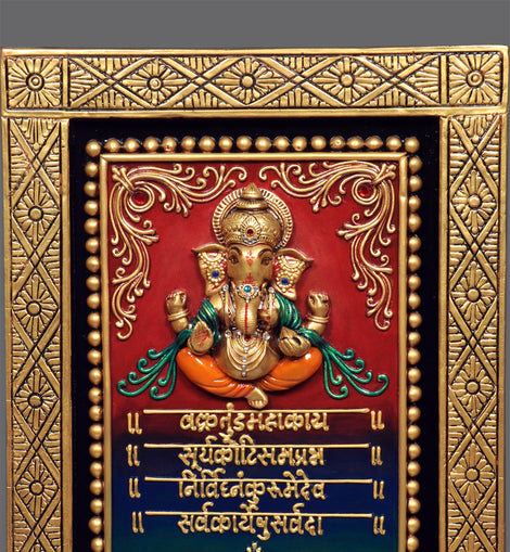 Wall Hanging Hand Crafted Maha Ganesh Mantra Mural in Ceramic Crush Material With Wooden Base, Fine Hand Crafted Art Work, Washable Material, With Natural Duco Paint Finish.