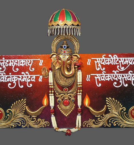 Wall Hanging Hand Crafted Chatri Ashiwad Ganesh Face Mural in Ceramic Crush Material With Wooden Base, Fine Hand Crafted Art Work, Washable Material, With Natural Duco Paint finish.